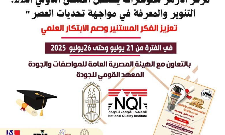 الملتقى الدولي الـ22 للتدريب والتنمية – مؤتمر التنوير والمعرفة: تحت رعاية أكاديمية بناة المستقبل الدولية وبمشاركة نخبة من الباحثين العرب من مختلف دول الوطن العربي في رحاب الأزهر الشريف”