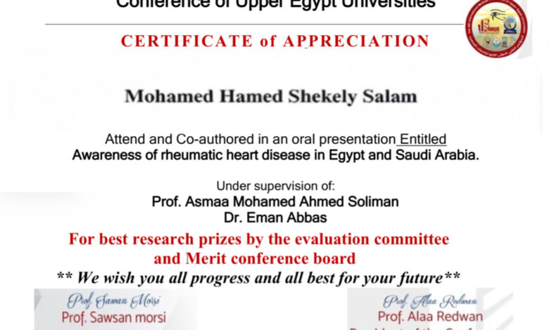 طالب طب يفوز بالمركز الثالث على مستوى جامعات الصعيد ببحث حول التوعية بمرض الحمى الروماتيزمية